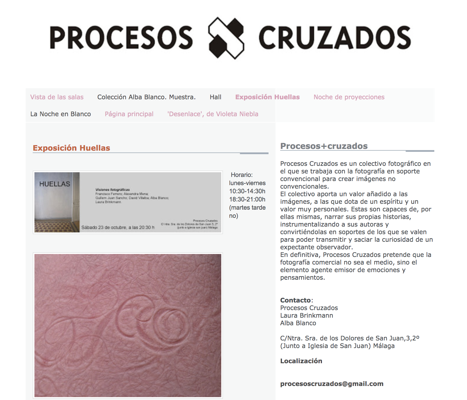 Alba Blanco ha formado junto a Laura Brinkmann el proyecto Procesos Cruzados, un colectivo fotográfico que, hasta 2014, supuso un lugar de encuentro en Málaga para la fotografía y el arte contemporáneo, contribuyendo a la divulgación y reflexión de este área de nuestra profesión. Posteriormente, el espacio continuaría siendo el taller de la artista y de gestión cultural tras el nombre «La oficina».