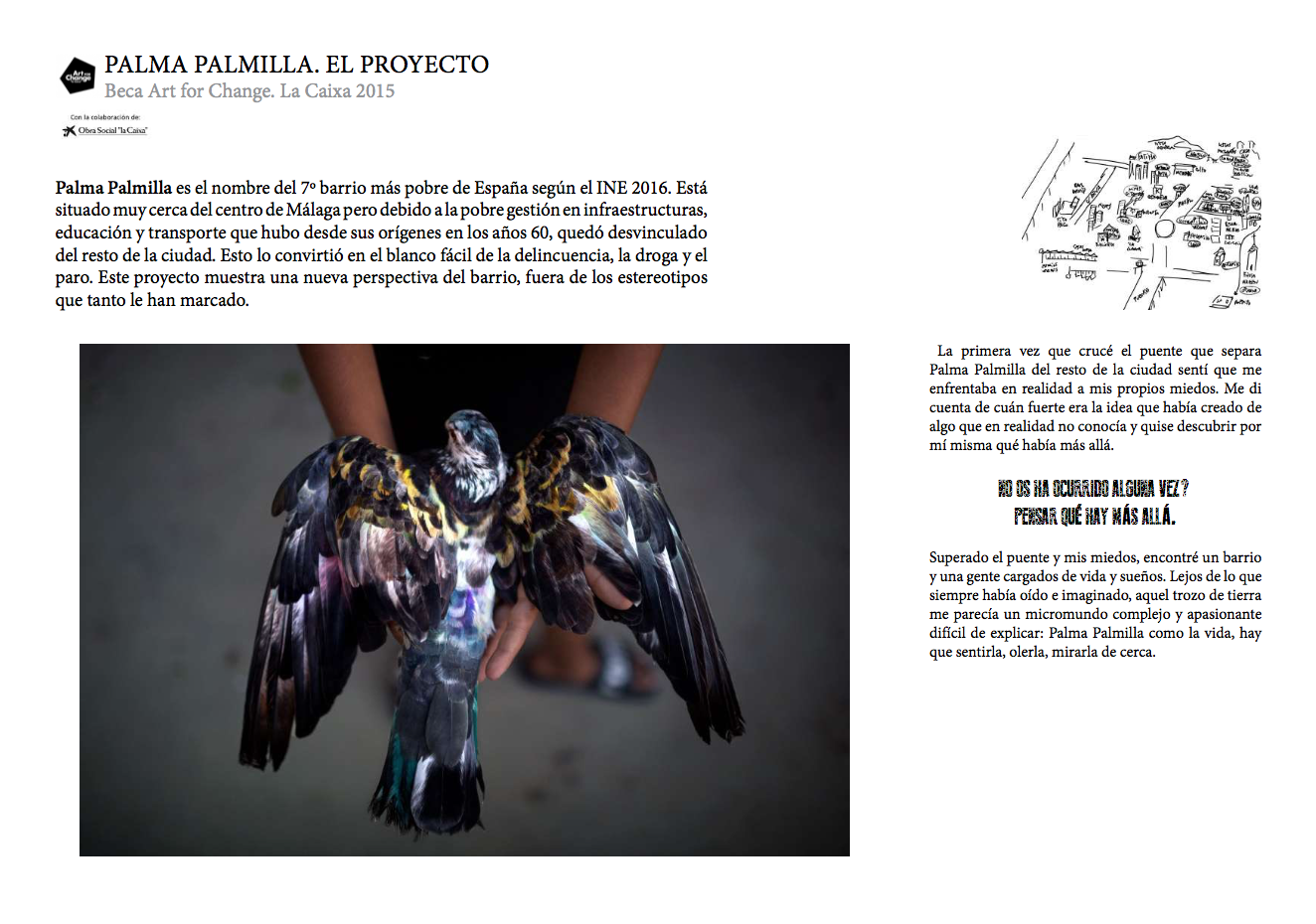 «La primera vez que crucé el puente que separa Palma Palmilla del resto de la ciudad sentí que me enfrentaba en realidad a mis propios miedos. Me di cuenta de cuán fuerte era la idea que había creado de algo que en realidad no conocía y quise descubrir por mí misma qué había más allá. ¿No os ha ocurrido alguna vez? Pensar qué hay más allá. Superado el puente y mis miedos, encontré un barrio y una gente cargados de vida y sueños. Lejos de lo que siempre había oído e imaginado, aquel trozo de tierra me parecía un micromundo complejo y apasionante difícil de explicar: Palma Palmilla como la vida, hay que sentirla, olerla, mirarla de cerca.