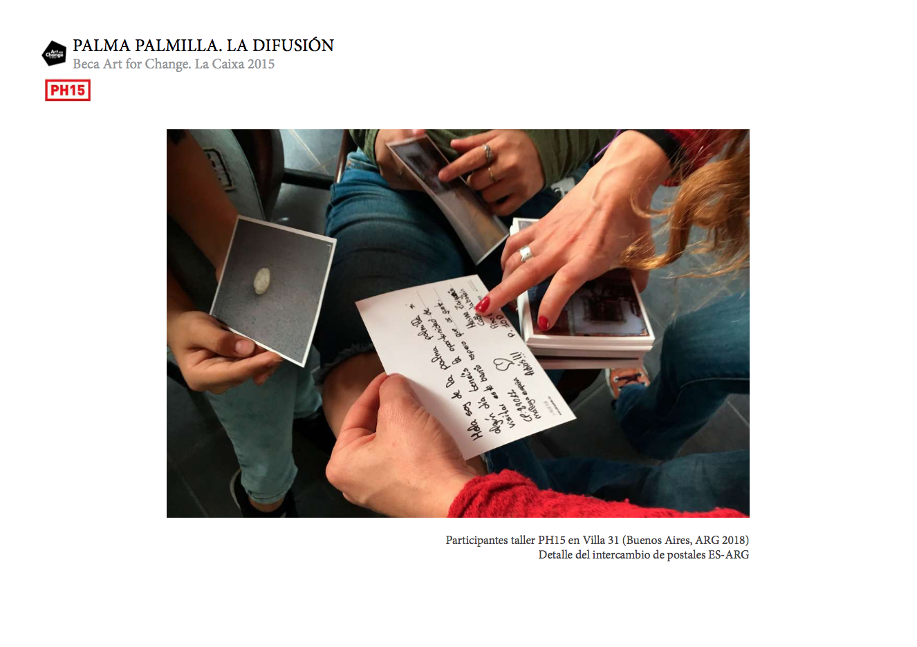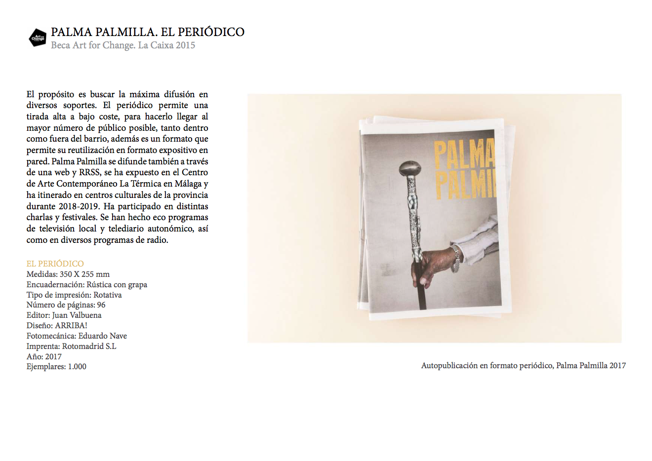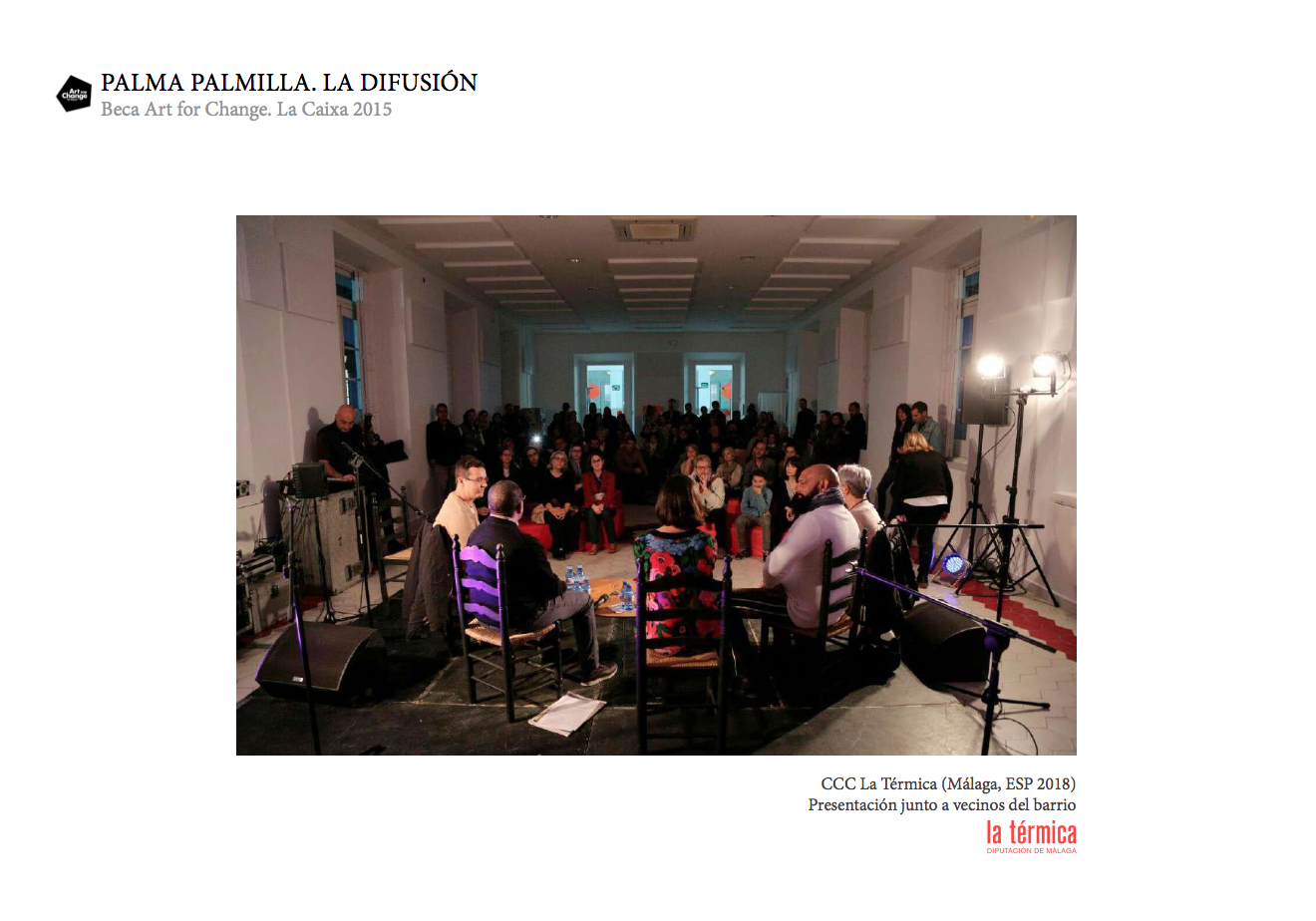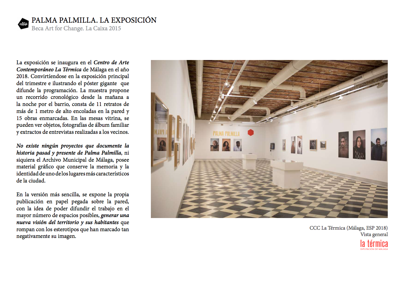 PALMA PALMILLA ha pasado a ser el proyecto que desmitificó un barrio en nuestra Málaga natal. Al ganar la beca Art for Change de La Caixa tuvo la posibilidad de itinerar y dar a conocer las peculiaridades y capas de realidad de este barrio, de manera que cada fotografiado ha sido también protagonista y relator de este viaje.
