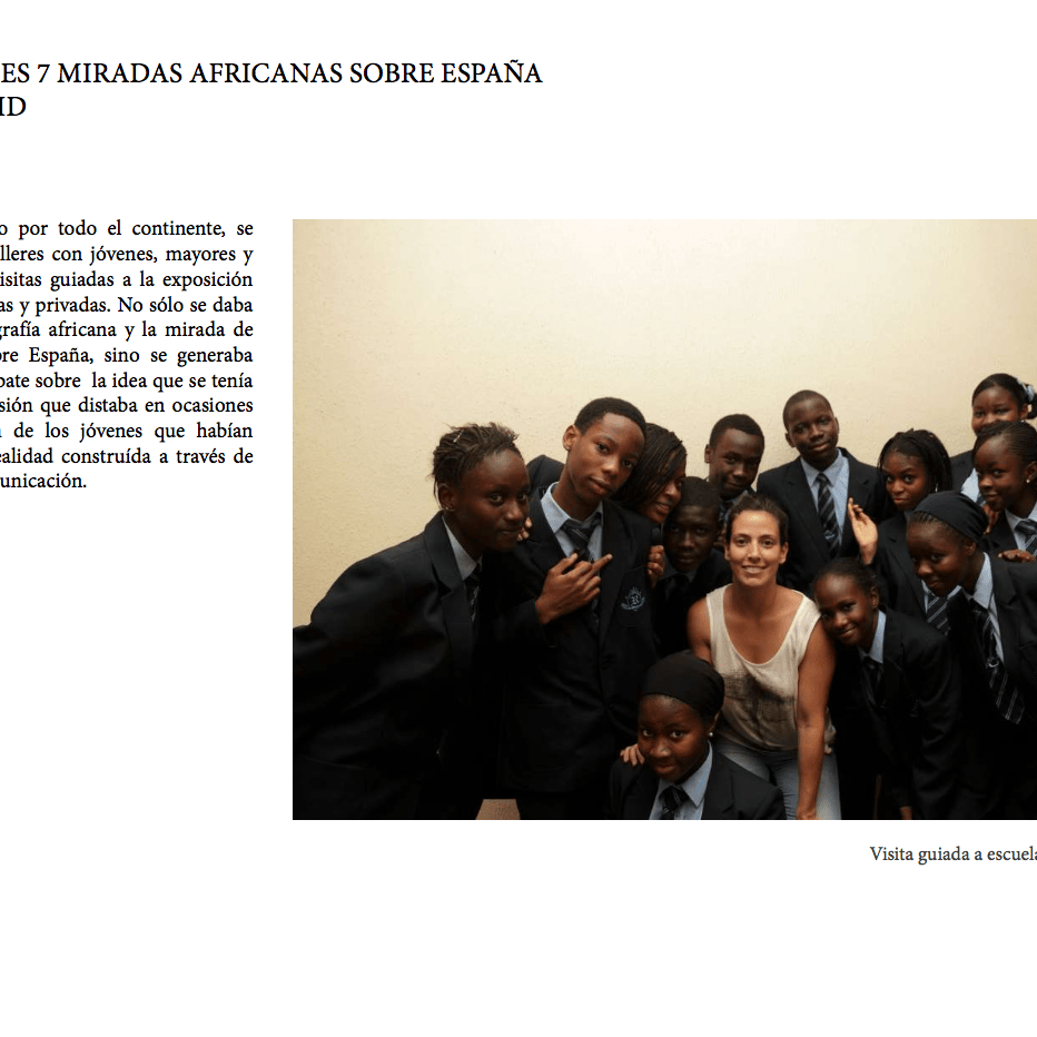 «Durante el trabajo por todo el continente, se llevaron a cabo talleres con jóvenes, mayores y niños, así como visitas guiadas a la exposición de escuelas públicas y privadas. No sólo se daba a conocer la fotografía africana y la mirada de los fotógrafos sobre España, sino se generaba conversación y debate sobre la idea que se tenía de Europa, una visión que distaba en ocasiones de la idealización de los jóvenes que habían consumido una realidad construída a través de los medios de comunicación.»