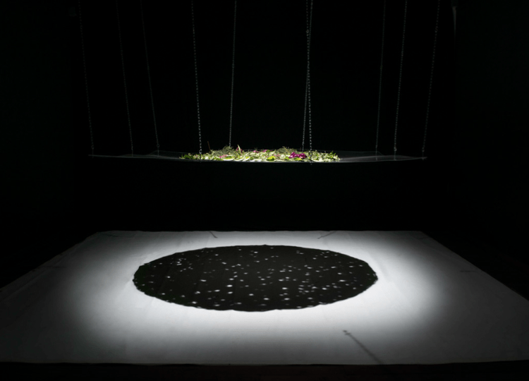 «La pieza, construida con una plancha de metacrilato sustentada por hilos de acero, soporta elementos vegetales encontrados en el territorio de Almedinilla. Un foco de luz dirigido hacia estos elementos naturales provoca un juego de luces y sombras que proyectadas en plano se nos antojan como un microcosmos observado desde las alturas. La pieza funciona como una alegoría inmaterial, vegetal y lumínica de otra más inabarcable e intangible que es el cosmos que habitamos. Y más concretamente el cielo estrellado que durante el proceso de creación podíamos observar sobre Almedinilla. Un pequeño y particular Big Bang de materia orgánica en descomposición (y por tanto en movimiento) de cuya observación diríase nos evoca el reverso de la creación.»