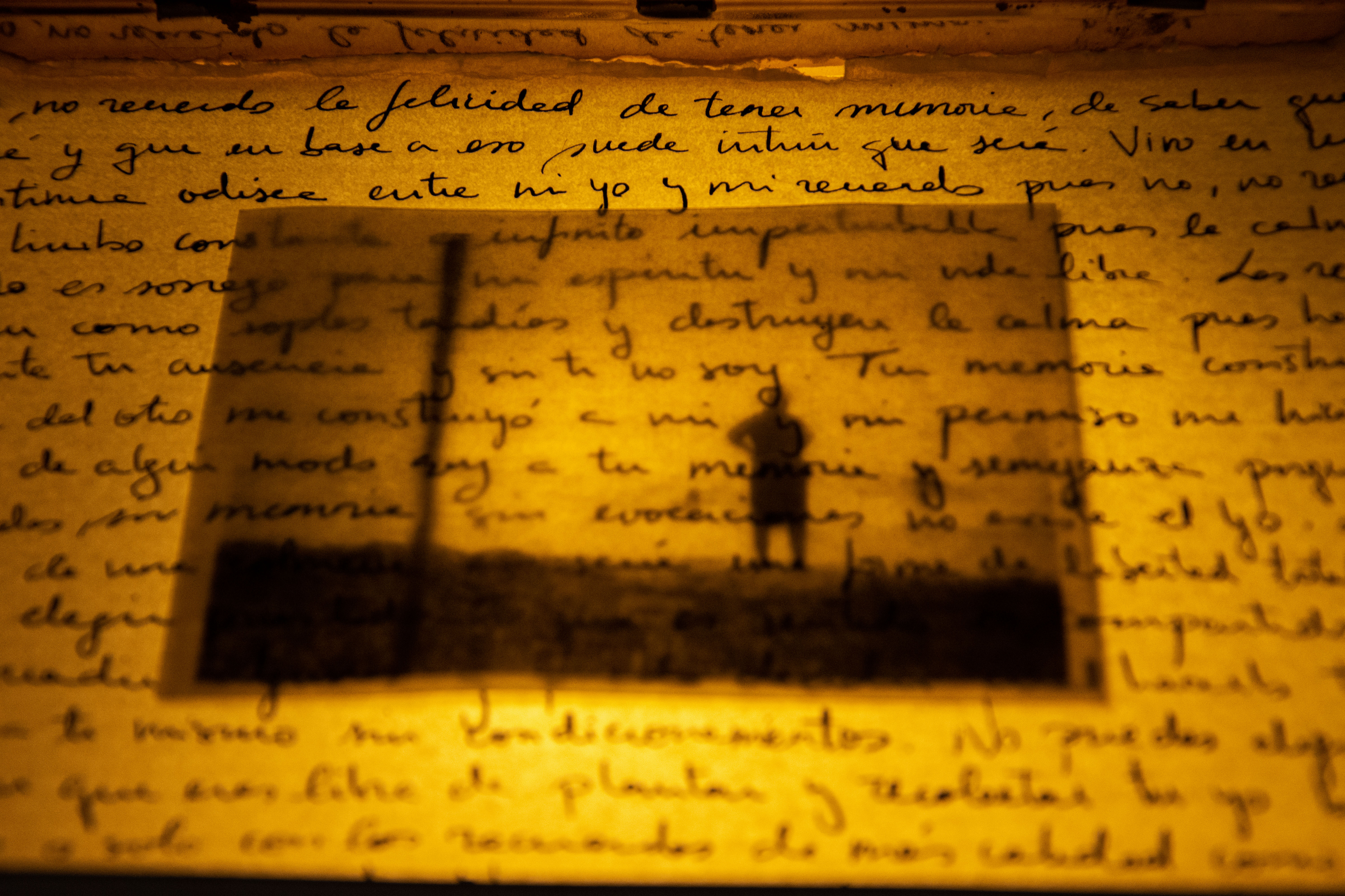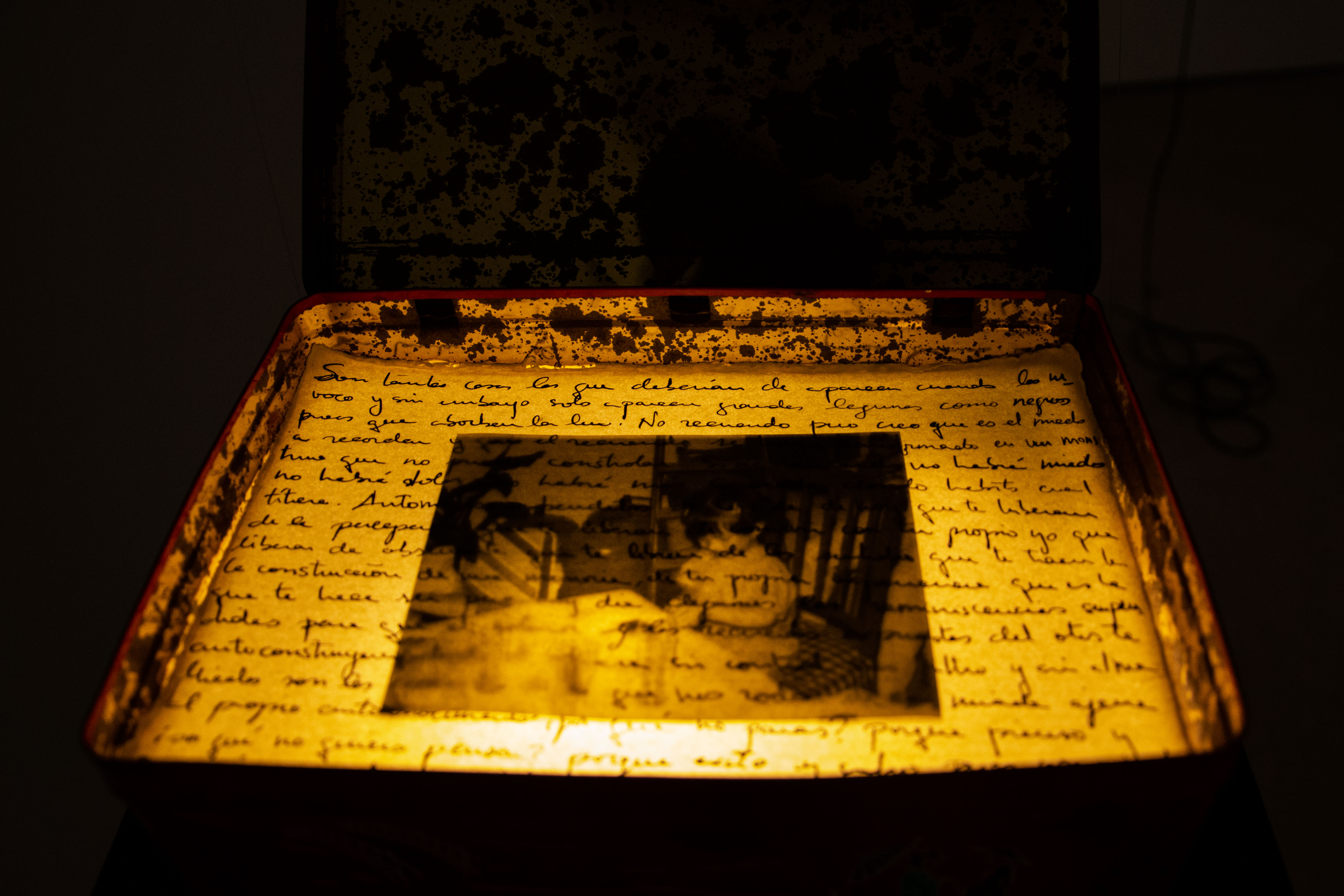 Reminiscencia Suspendida es un proyecto en el que mediante un juego de luz, texto, fotografías y sonidos, la artista explora la fragilidad de la memoria y su papel en la definición del yo.