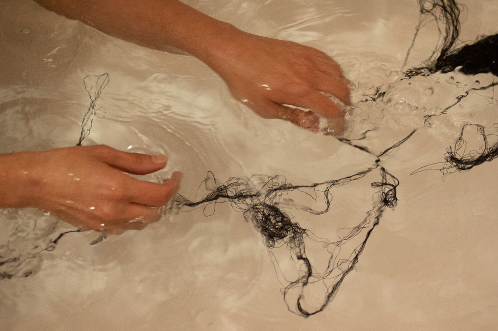 A través de las fotografías se muestra una especie de ritual que sirve en cierto modo de resistencia, una forma de tratar de recuperar el equilibrio, de “respiros” para trazar recorridos ya hechos y proyectar otros. El hilo y el agua son empleados como símbolos.